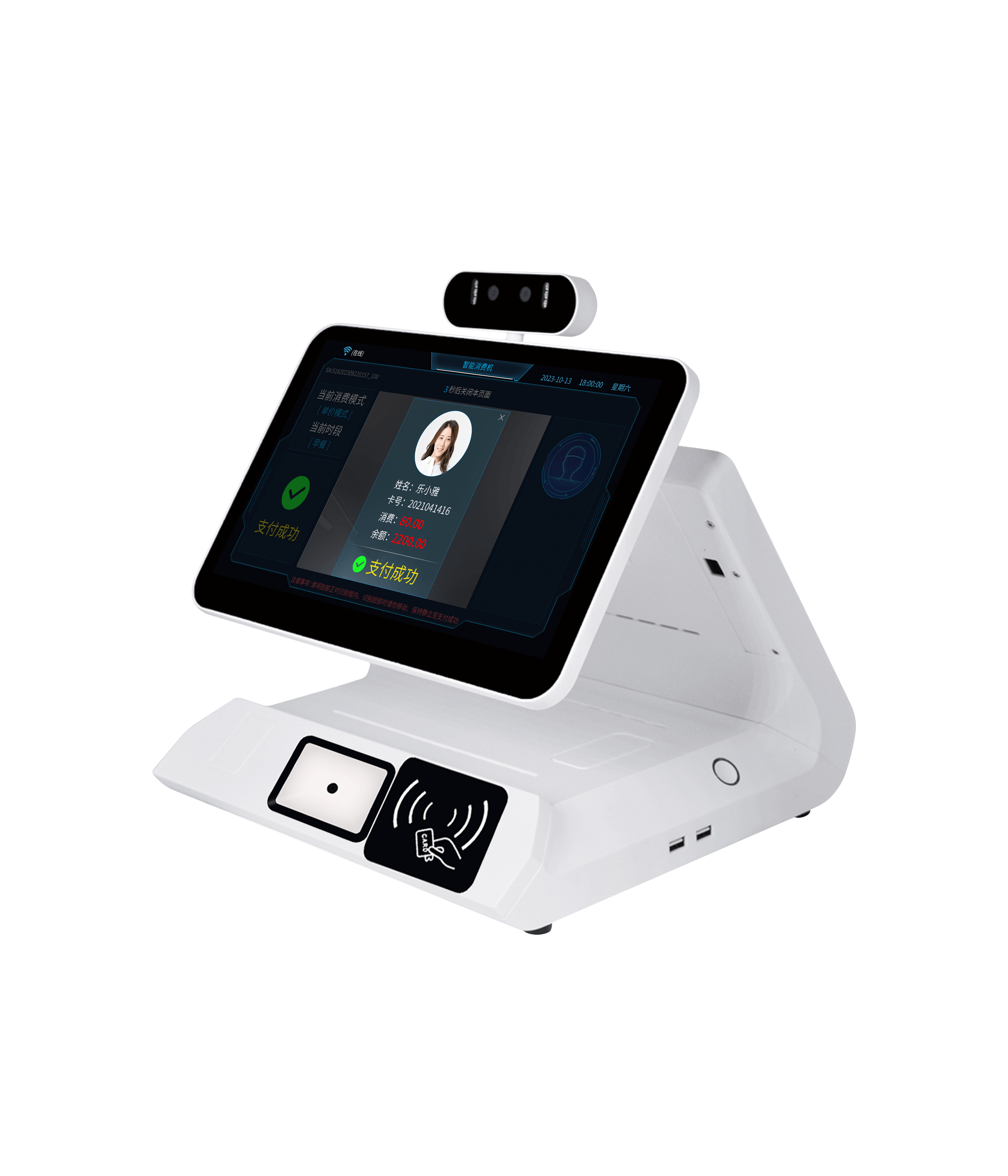 除了掃碼支付,優卡特設備集成語音交互、人臉識別、手勢感應等功能。例如在超市場景中,消費者只需說出“用會員積分支付”,設備即可自動完成抵扣計算;在快餐店,AI攝像頭可識別餐盤數量并秒級生成賬單,減少人工核驗成本。